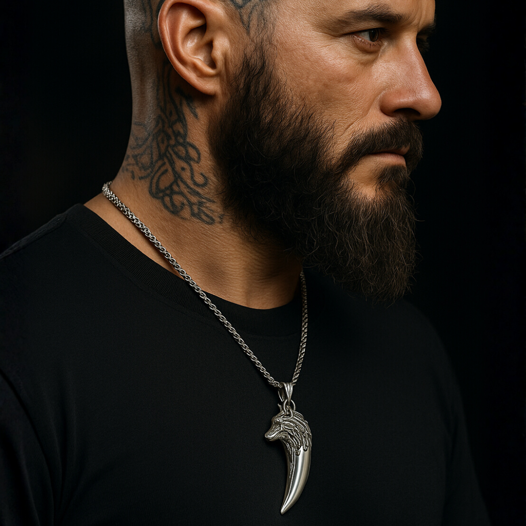 • Stil: Polierter Wolfszahn mit detaillierter Wolfskopf-Gravur